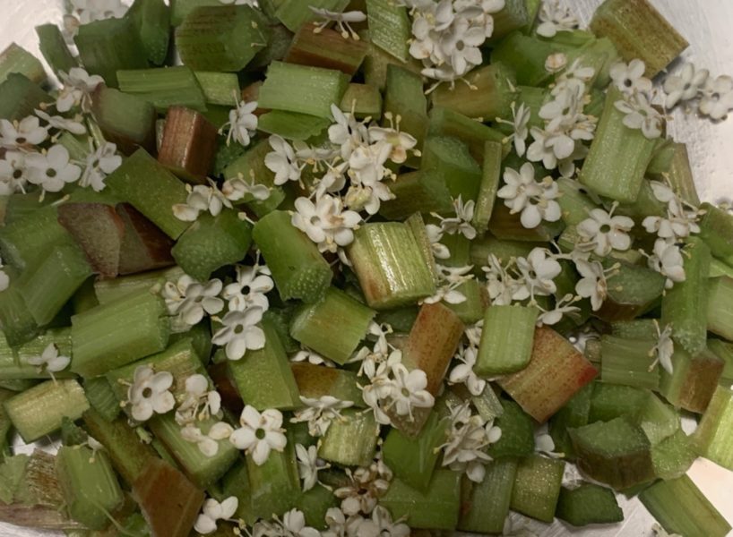 Lavez les côtes de rhubarbe et coupez-les en tronçons. Détachez les fleurs de sureaux des ombelles en les débarrassant le plus possible des tiges. Procédez par exemple comme le suggère Nadine Mori : en utilisant une fourchette ou un peigne à dents assez rapprochées.