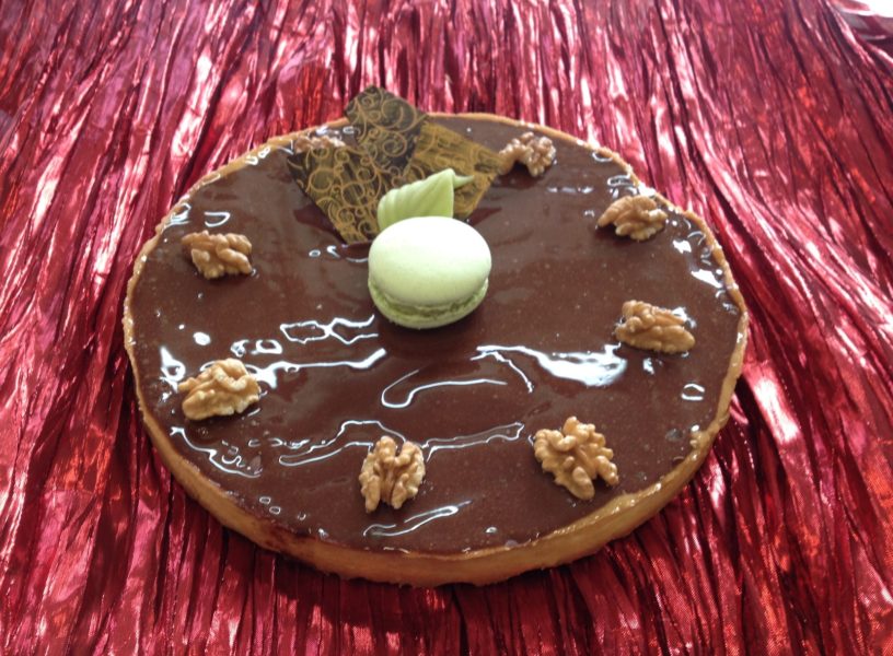 Un fond de tarte en pâte sablée, cuit à blanc, est recouvert d’une ganache au chocolat noir, et, en finition, de cerneaux de noix.